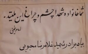 شهید غلامرضا محبوبی خمینی بر اثر اصابت گلوله به یک چشم و همچنین قلبش در شانزدهم تیر ماه سال ۶۵ در منطقه عملیاتی مهران و در تپههای قلاویزان به فیض شهادت رسید. به نقل از برادرم، همسرم را با سیمینوف (یک نوع اسلحه جنگی دقیق) به شهادت رساندند.