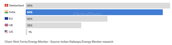 همانطور که در نمودار زیر مشاهده می فرمایید، راه آهن هند با نرخ ۹۴ درصدی برقی سازی خود، پس از سوئیس در رتبه دوم جهان ایستاده و این در حالیست که تنها ۵۶ درصد خطوط ریلی اتحادیه اروپا برقی سازی شده اند!