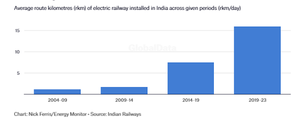 از سال ۲۰۱۴، بیش از ۴۰ هزار کیلومتر از خطوط ریلی هند برقی سازی شده این در حالیست که پیش از آن، کل خطوط ریلی برقی هند به ۲۱۸۰۱ کیلومتر میرسید. با این حساب، در بازه سال های ۲۰۱۹ تا ژانویه ۲۰۲۴، نرخ برقی سازی خطوط ریلی در هند حدود ۹۴ درصد افزایش داشته است.