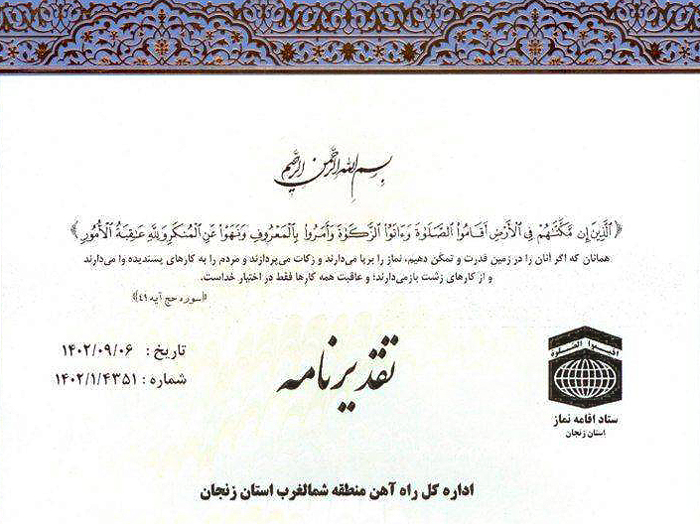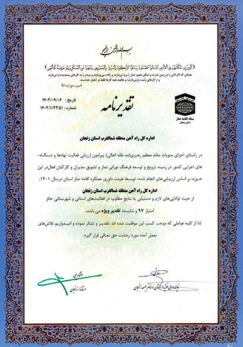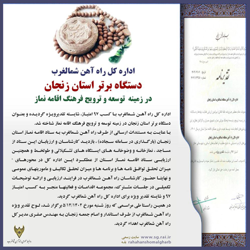 اداره کل راه آهن شمالغرب، با کسب ۹۷ امتیاز، شایسته تقدیر ویژه شد و به عنوان دستگاه برتر استان زنجان در زمینه توسعه و ترویج فرهنگ اقامه نماز شناخته شد.