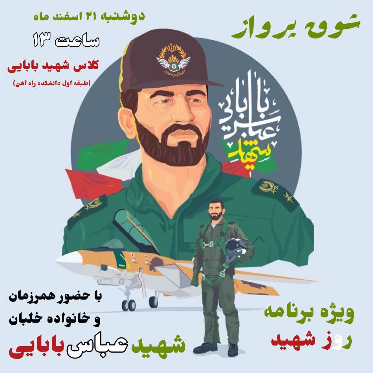 به گزارش پایگاه خبری ریل نیوز، ویژه برنامه روز شهید با حضور همرزمان و خانواده خلبان شهید عباس بابایی مورخ دوشنبه ۲۱ اسفندماه، ساعت ۱۳ در محل کلاس شهید بابایی واقع در طبقه اول دانشکده راهآهن برگزار میشود.