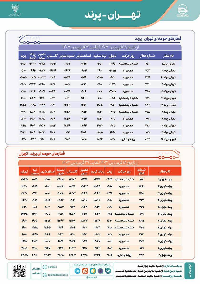 جدول برنامه قطارهای حومهای تهران - پرند از تاریخ 18 فروردین 1403 لغایت 31 فروردین 1403 بدین شرح میباشد: