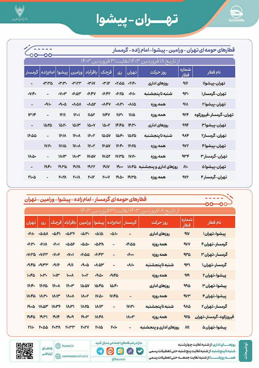 جدول برنامه قطارهای حومهای تهران - ورامین - پیشوا - امامزاده - گرمسار از تاریخ 18 فروردین 1403 لغایت 31 فروردین 1403 بدین شرح میباشد: