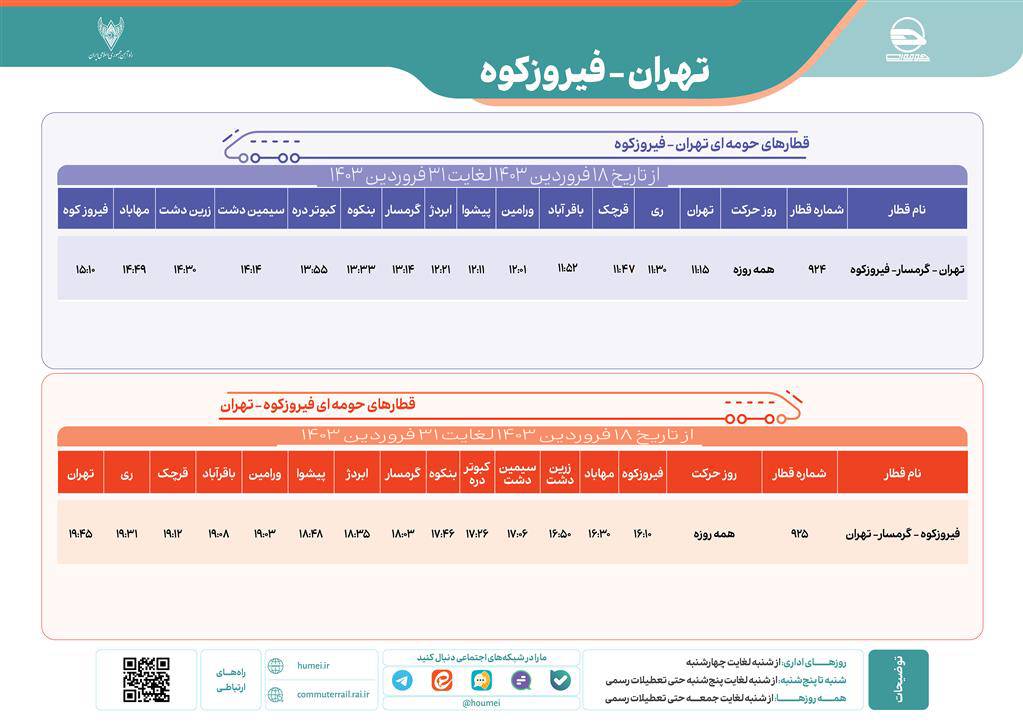 جدول برنامه قطارهای حومهای تهران - فیروزکوه از تاریخ 18 فروردین 1403 لغایت 31 فروردین 1403 بدین شرح میباشد: