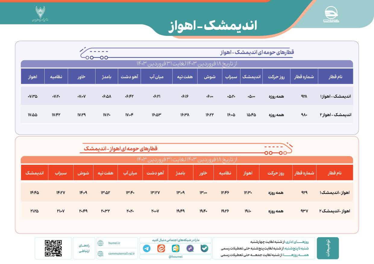 جدول برنامه قطارهای حومهای اندیمشک - اهواز از تاریخ 18 فروردین 1403 لغایت 31 فروردین 1403 بدین شرح میباشد:
