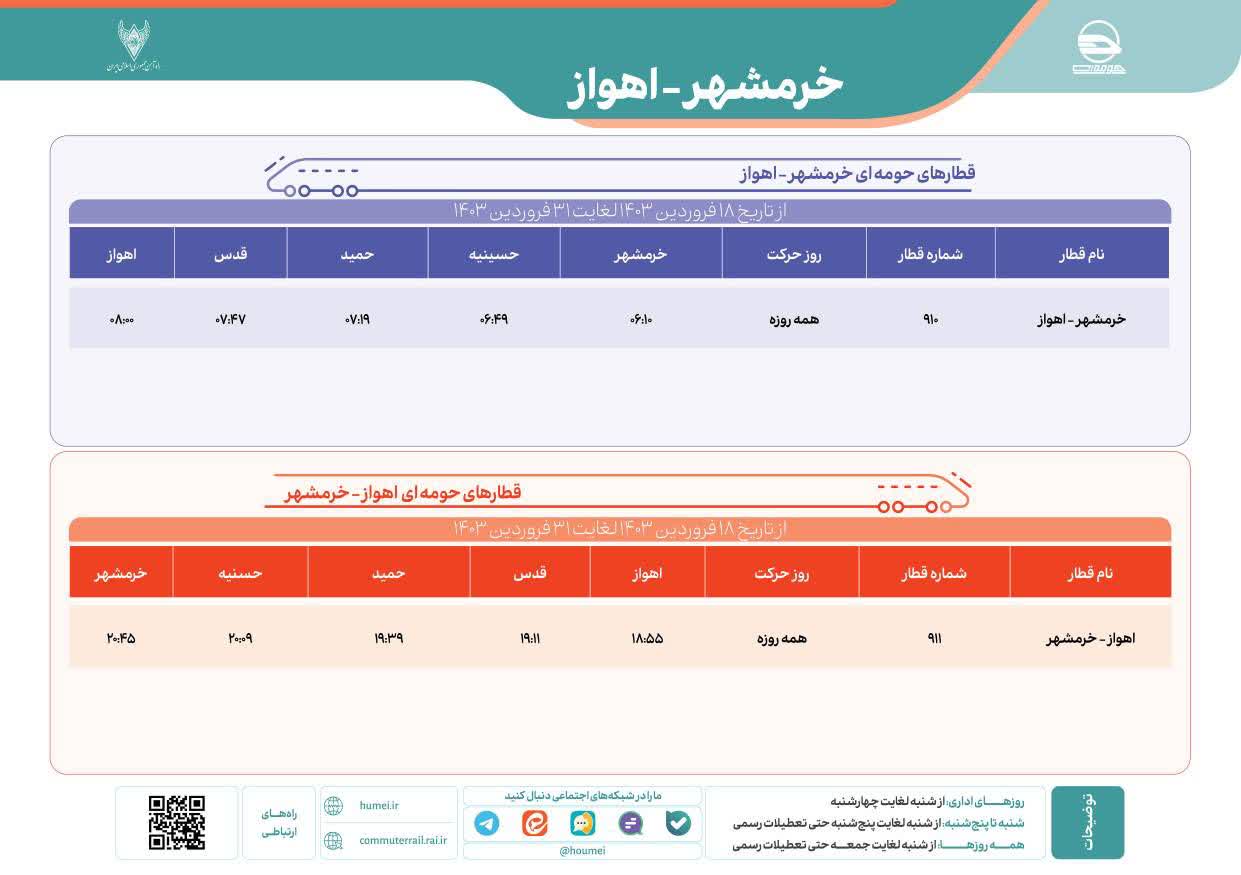جدول برنامه قطارهای حومهای خرمشهر - اهواز از تاریخ 18 فروردین 1403 لغایت 31 فروردین 1403 بدین شرح میباشد: