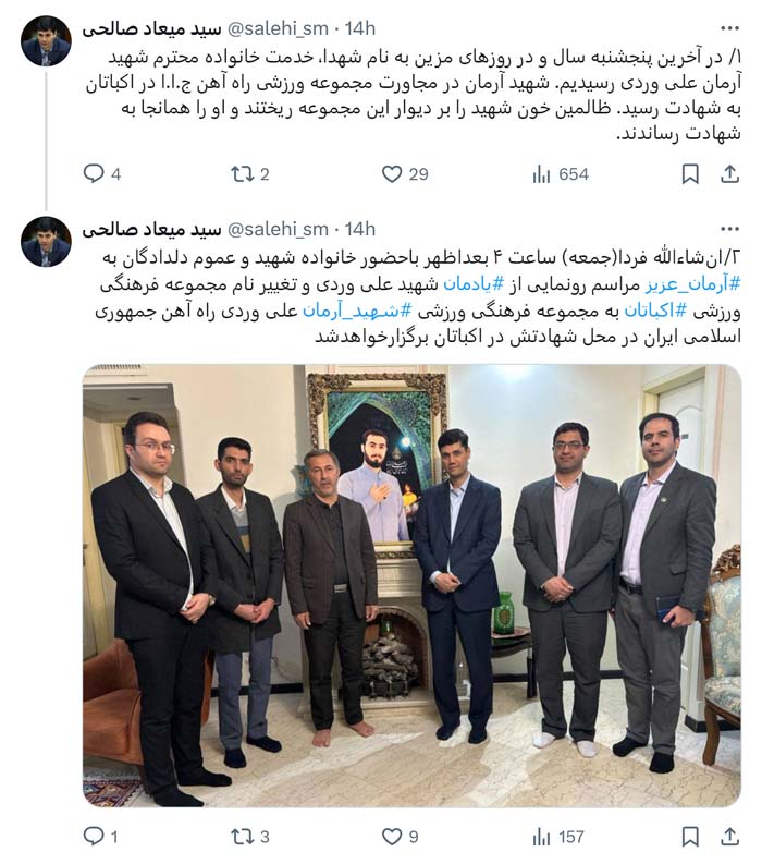 حضور مدیرعامل راهآهن در منزل شهید آرمان علی وردی/ نام مجموعه ورزشی اکباتان تغییر خواهد کرد