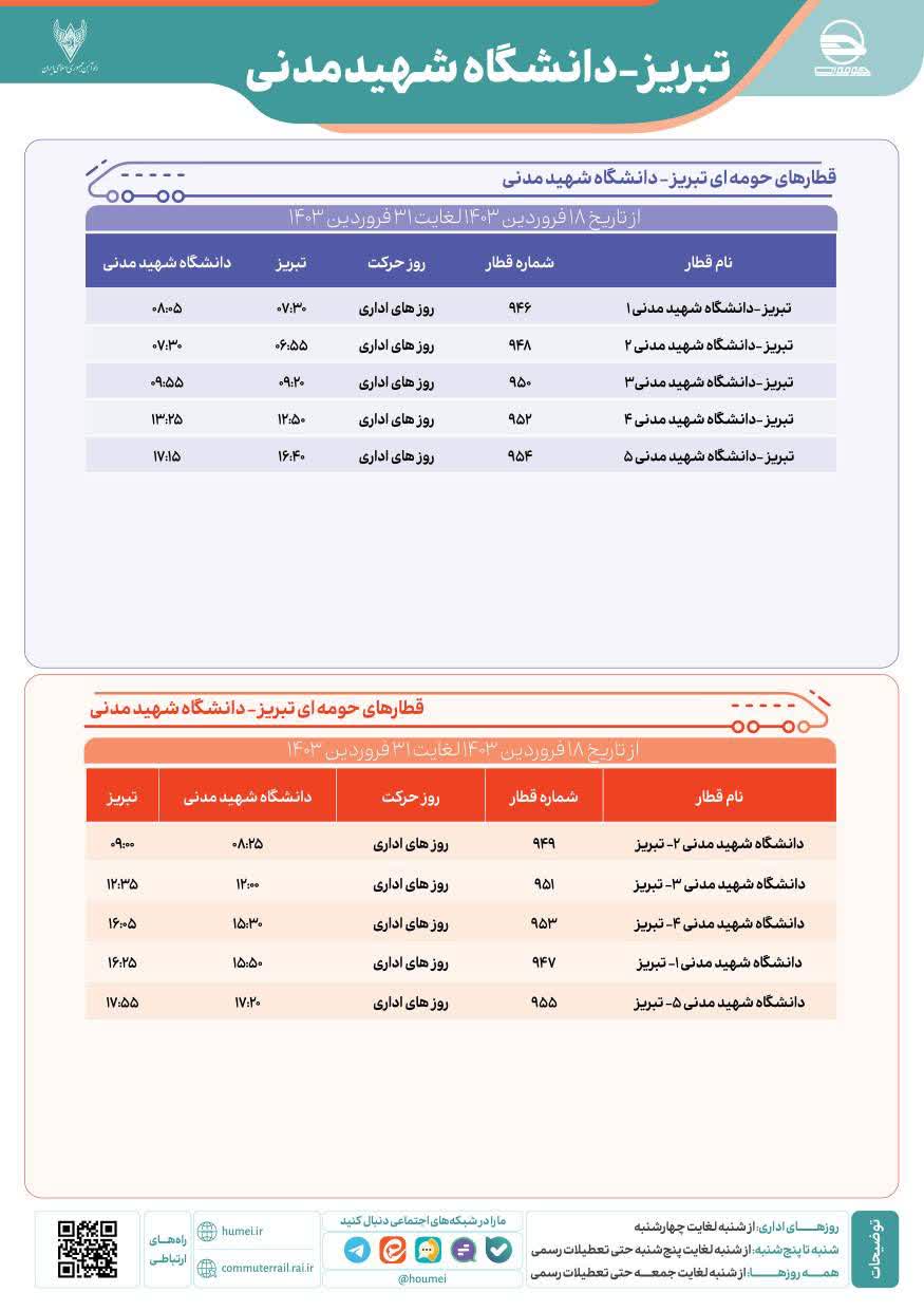 جدول برنامه قطارهای حومهای تبریز - دانشگاه شهید مدنی از تاریخ 18 فروردین 1403 لغایت 31 فروردین 1403 بدین شرح میباشد: