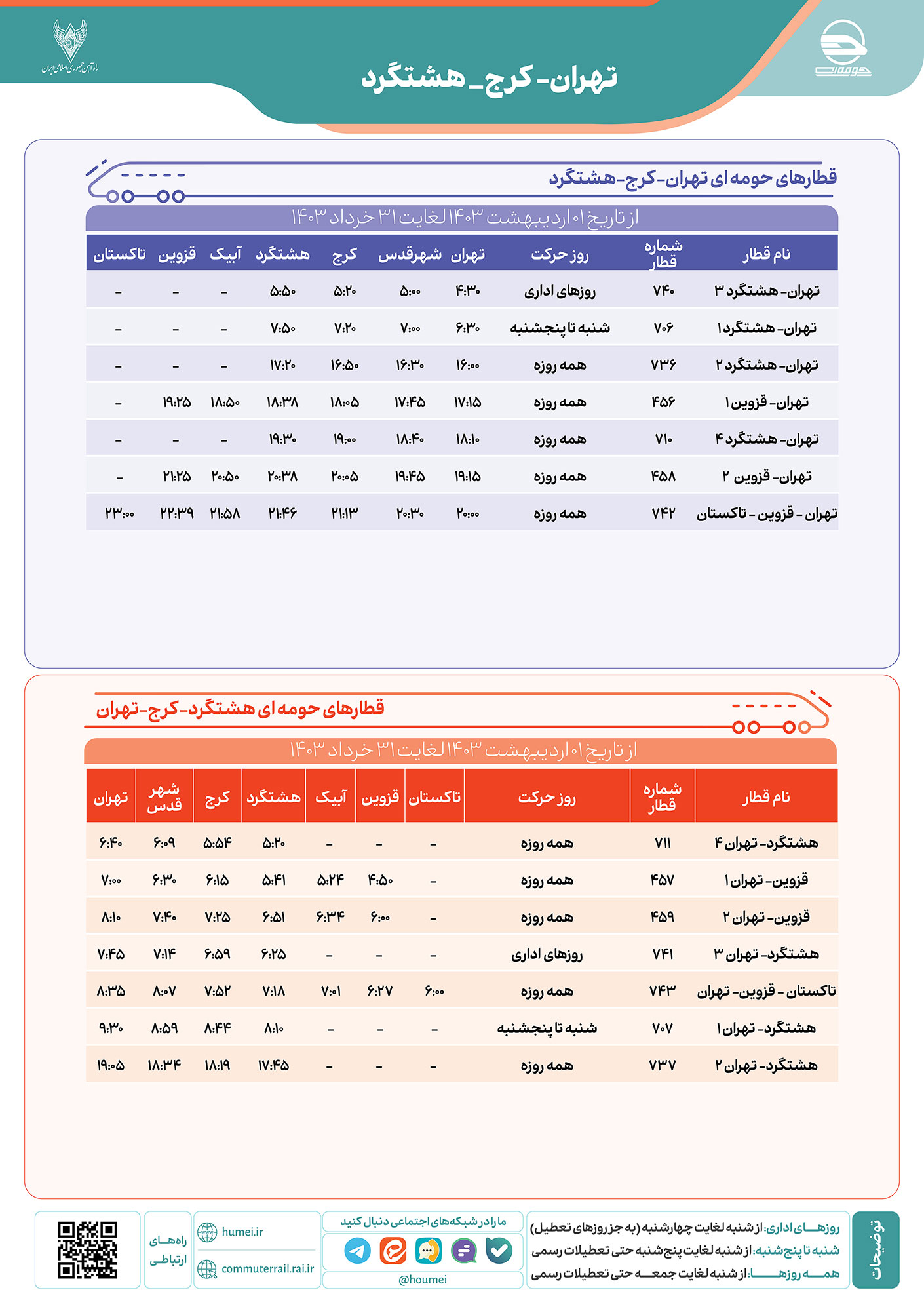 برنامه قطار تهران – هشتگرد – قزوین رفتوبرگشت/ اردیبهشتوخرداد۱۴۰۳