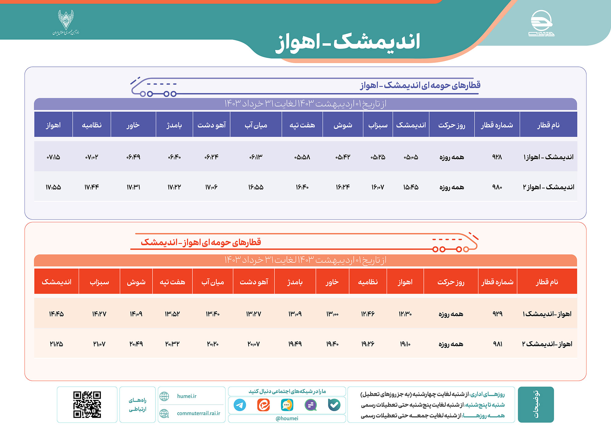 جدول برنامه حرکت قطارهای حومهای اندیمشک – اهواز به صورت رفت و برگشت از تاریخ ۱ اردیبهشت ماه لغایت ۳۱ خرداد ۱۴۰۳ منتشر شد.