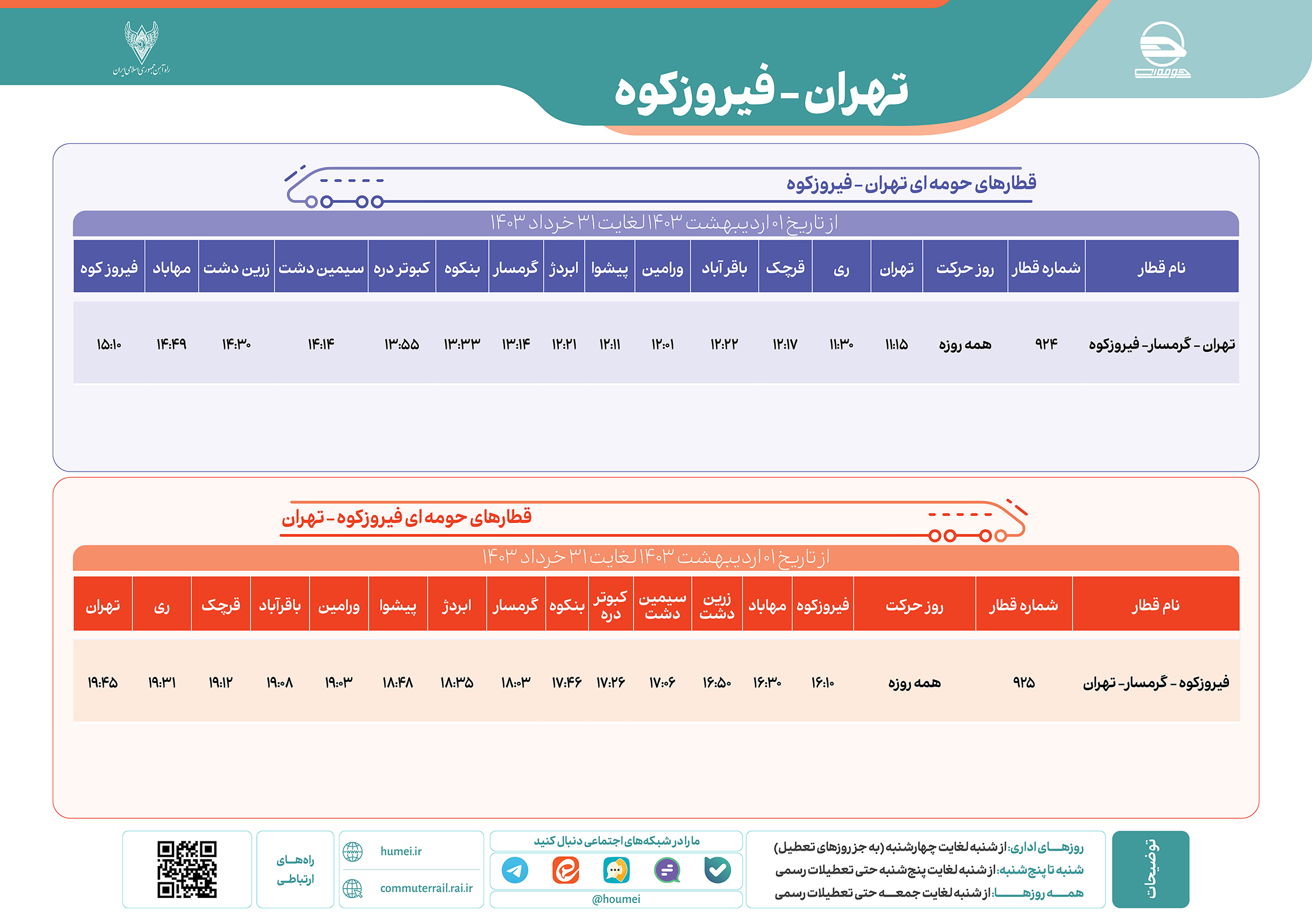 جدول برنامه حرکت قطارهای حومهای تهران – فیروزکوه به صورت رفت و برگشت از تاریخ ۱ اردیبهشت ماه لغایت ۳۱ خرداد ۱۴۰۳ منتشر شد.