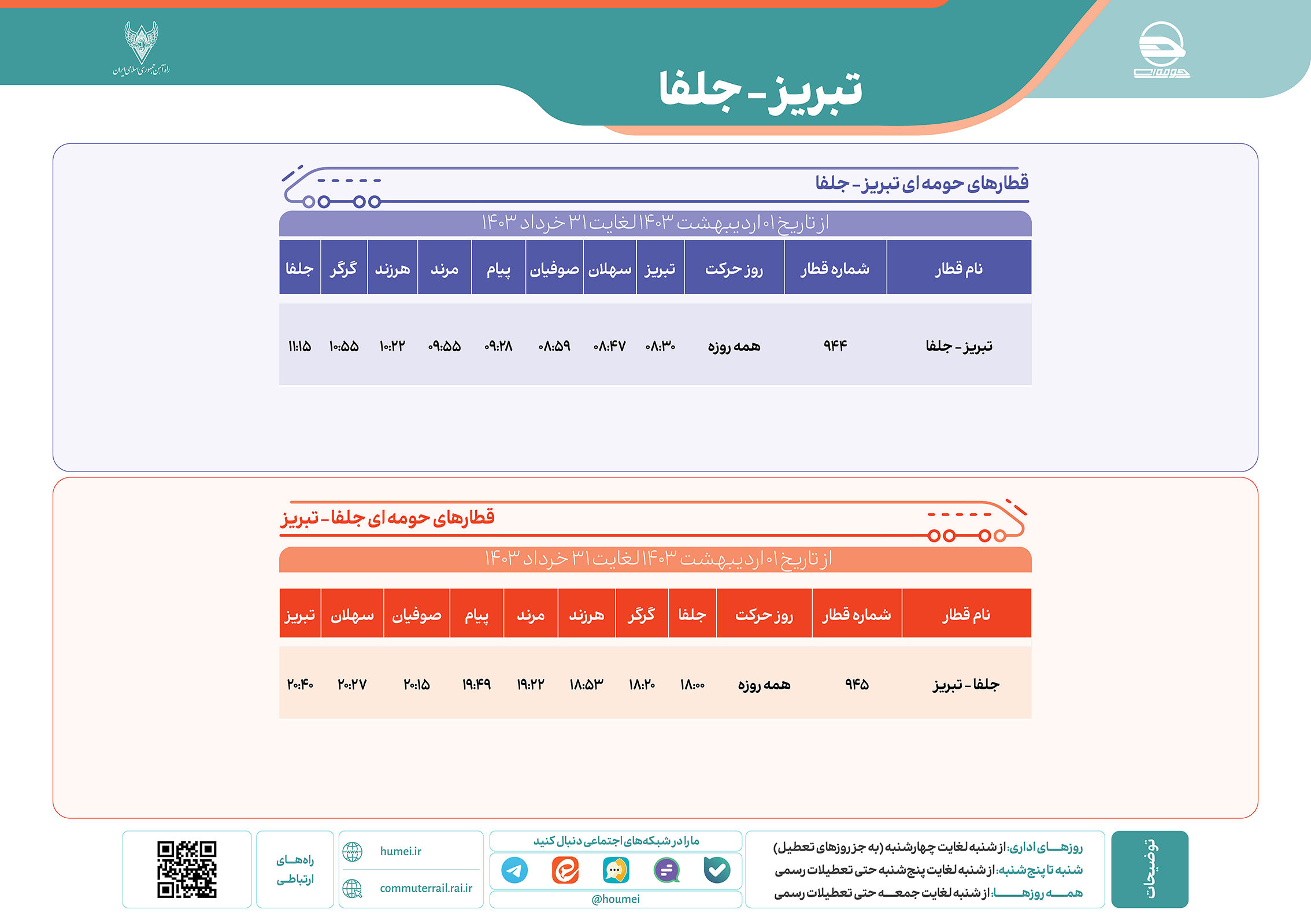 برنامه قطار تبریز – جلفا رفتوبرگشت/ اردیبهشتوخرداد۱۴۰۳