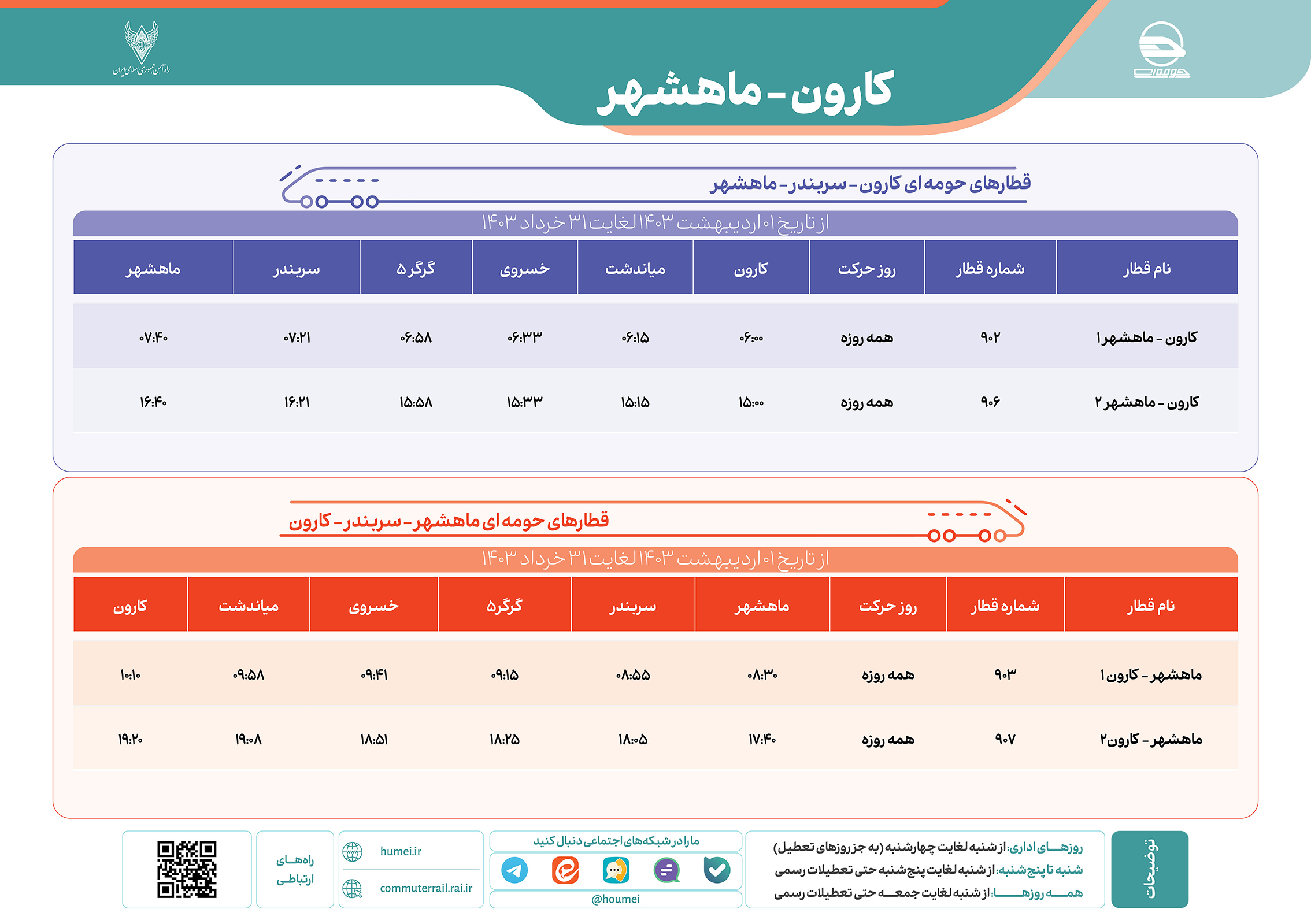 برنامه قطار کارون – ماهشهر رفتوبرگشت/ اردیبهشتوخرداد۱۴۰۳