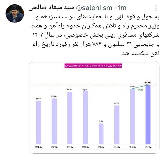 به گزارش پایگاه خبری ریل نیوز، سید میعاد صالحی، مدیرعامل راهآهن در فضای مجازی نوشت: به حول و قوه الهی و با حمایتهای دولت سیزدهم و وزیر محترم راه و تلاش همکاران خدوم راهآهن و همت شرکتهای مسافری ریلی بخش خصوصی، در سال ۱۴۰۲ با جابجایی ۳۱ میلیون و ۷۸۴ هزار نفر، رکورد تاریخ راهآهن شکسته شد.