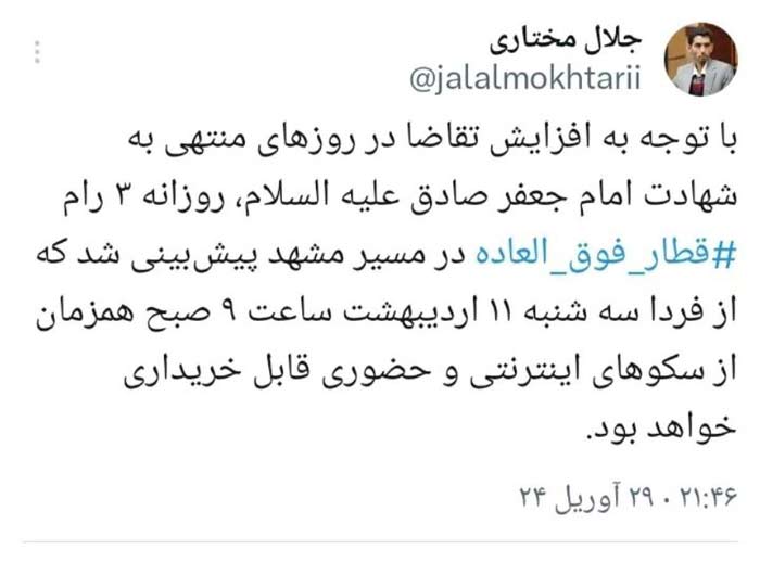 “با توجه به افزایش تقاضا در روزهای منتهی به شهادت امام جعفر صادق علیه السلام، روزانه سه رام قطار فوق العاده در مسیر مشهد پیش بینی شد که از روز سهشنبه ۱۱ اردیبهشت، ساعت ۹ صبح همزمان از سکوهای اینترنتی و حضوری قابل خریداری خواهد بود.”