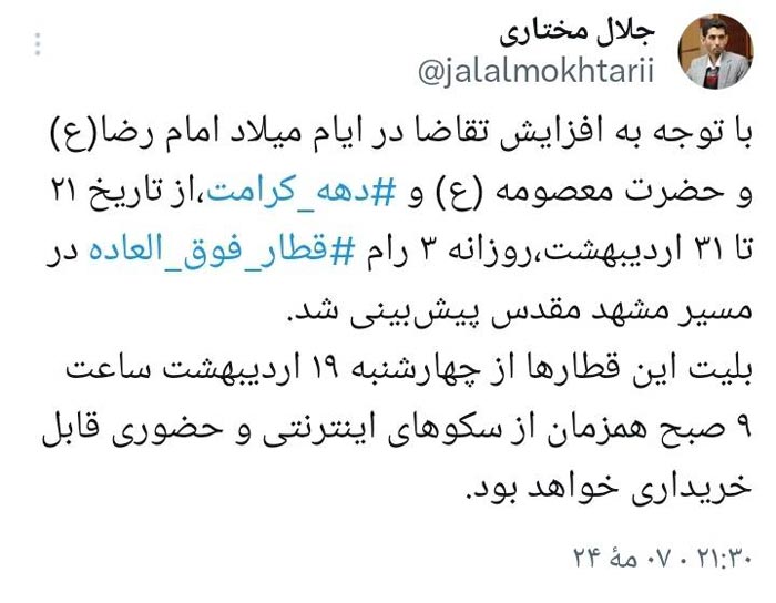 جلال مختاری، مدیرکل روابط عمومی راهآهن در فضای مجازی نوشت: