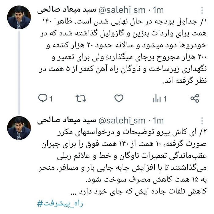 ای کاش پیرو توضیحات و درخواست های مکرر صورت گرفته، ۱۰ همت از ۱۴۰ همت فوق را برای جبران عقبماندگی تعمیرات ناوگان و خط و علائم ریلی میگذاشتند تا با افزایش جابه جایی بار و مسافر، منجر به ۱۵ همت کاهش مصرف سوخت شود.