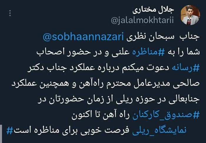 “جناب سبحان نظری شما را به مناظره علنی و در حضور اصحاب رسانه دعوت میکنم درباره عملکرد جناب دکتر صالحی مدیرعامل محترم راهآهن و همچنین عملکرد جنابعالی در حوزه ریلی از زمان حضورتان در صندوق کارکنان راه آهن تا اکنون.