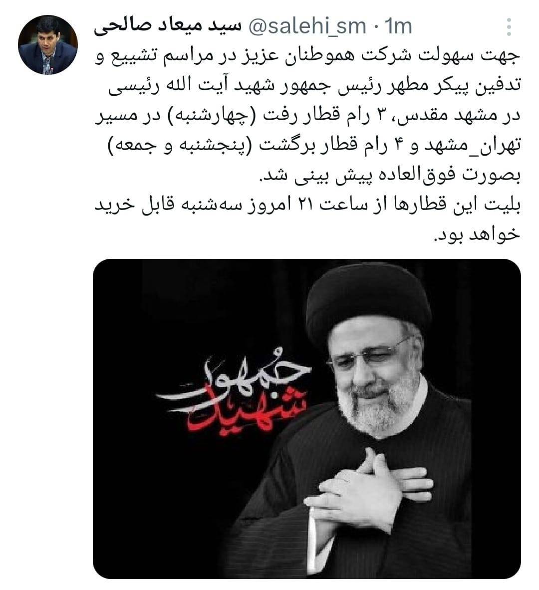 برقراری قطارهای فوق العاده تهران_مشهد و بالعکس جهت مراسم تشییع شهید آیت الله رییسی در مشهد