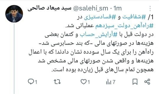 شفافیت و فسادستیزی در راهآهن_دولت_سیزدهم عملیاتی شد.در دولت قبل با آرایش حساب و کتمان بعضی هزینهها در صورتهای مالی -که بند حسابرسی شد- راهآهن را برای یک سال سودده نشان دادند! که با اعمال هزینهها و واقعی شدن صورتهای مالی مشخص شد همچون تمام سالهای قبل زیانده بوده است.