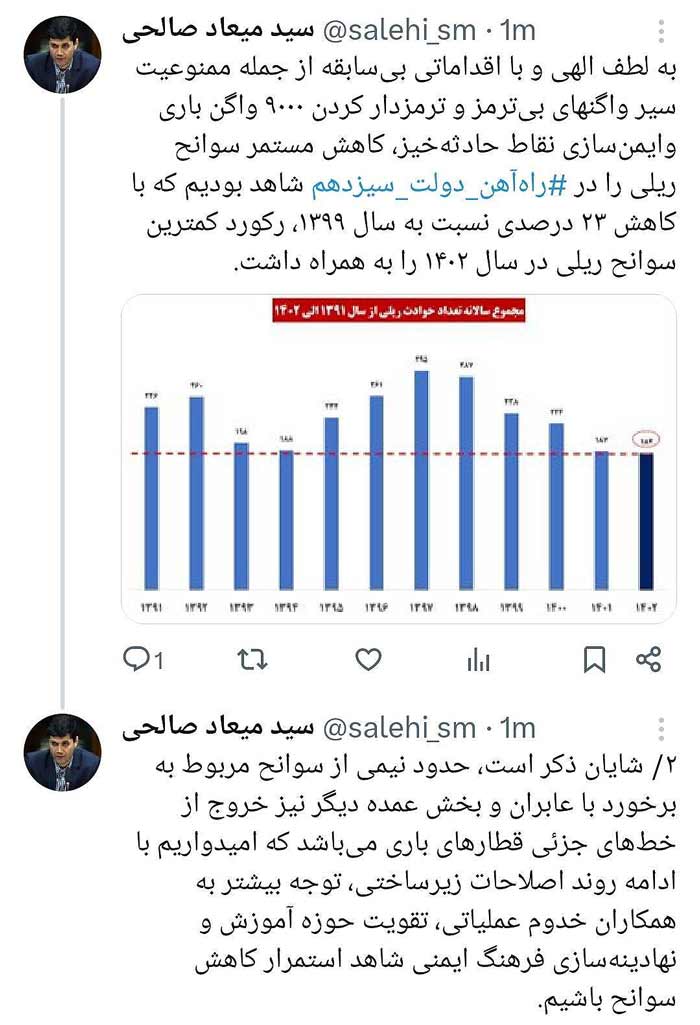سید میعاد صالحی، مدیرعامل راه آهن در صفحه شخصی خود نوشت: