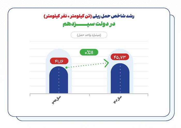 اما آنچه تعیین کننده عملکرد راه آهن است، نه حمل بار و نه حمل مسافر به تنهایی است بلکه شاخص حمل ریلی است که مجموع عملکرد حمل بار و مسافر ریلی را نشان می دهد و این شاخص در سال ۱۴۰۲ نسبت به سال ۱۳۹۹، ۱۱ درصد رشد داشت. البته این در شرایطی بود که عدم تامین منابع لازم برای نگهداری و تعمیرات به موقع ناوگان از سال ۱۳۹۷ به بعد، آماده به کاری لکوموتیوها از سال ۱۳۹۹ رو به کاهش بود که با تلاش ها و پیگیری های شبانه روزی مدیرعامل و همکاران راهآهن جمهوری اسلامی ایران و تامین بخشی از منابع مورد نیاز در دولت سیزدهم تا حدودی کنترل شد.