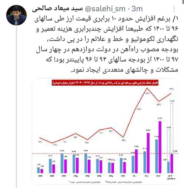 به گزارش پایگاه خبری ریل نیوز، سید میعاد صالحی، در صفحه شخصی خود در فضای مجازی نوشت: برغم افزایش حدود ۱۰ برابری قیمت ارز طی سالهای ۹۶ تا ۱۴۰۰ که طبیعتا افزایش چندبرابری هزینه تعمیرونگهداری لکوموتیو و خط و علائم را در پی داشت، بودجه مصوب راهآهن در دولت دوازدهم در چهار سال ۹۷ تا ۱۴۰۰ از بودجه سالهای ۹۴ تا ۹۶ پایینتر بود! که مشکلات و چالشهای متعددی ایجاد نمود.