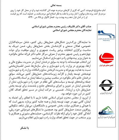 در نامه انجمن صنفی شرکتهای حملونقل ریلی و خدمات وابسته، انجمن صنایع ریلی ایران، انجمن مهندسی حملونقل ریلی ایران و کانون هماهنگی دانش، صنعت و بازار حملونقل ریلی به محمدباقر قالیباف، رئیس مجلس شورای اسلامی در حمایت از معرفی خانم فرزانه صادق مالواجرد بهعنوان وزیر پیشنهادی راه و شهرسازی دولت چهاردهم آمده است: «ما نمایندگان بزرگترین تشکلهای ریلی کشور، شامل سرمایهگذاران خصوصی، فعالان صنعتی و علمی حوزه حملونقل ریلی، ضمن تبریک به مناسبت برگزاری انتخابات پرشور ریاستجمهوری و آرزوی موفقیت برای دولت سیزدهم و رئیسجمهور، از انتخاب شایسته «فرزانه صادق مالواجرد» بهعنوان وزیر پیشنهادی راه و شهرسازی استقبال گرم میکنیم.»