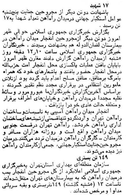۴۰ سال پیش، انفجار یک بمب در میدان راهآهن تهران، باعث شهادت و مصدوم شدن شهروندان شد.