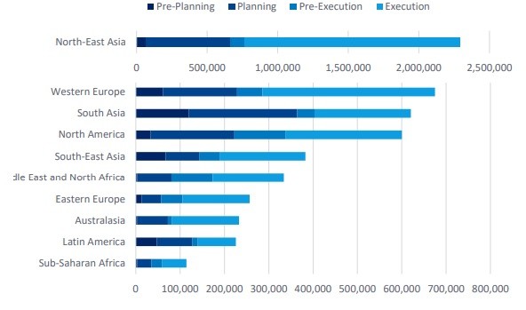 گلوبال دیتا با جمع آوری اطلاعات تمامی پروژه های در حال ساخت ریلی در سراسر جهان، ارزش مجموع آنها را حدود ۵.۷ تریلیون دلار اعلام کرده است. البته این رقم شامل پروژه هایی که برای ساخت آنها برنامه ریزی شده نیز می شود. مجموع ارزش پروژه های ریلی زیرساختی در منطقه خاورمیانه و شما آفریقا (مِنا) به حدود ۳۳۳.۸ ترزیلیون دلار می رسد که رتبه پنجم سرمایه گذاری های ریلی در جهان را به خود تخصیص داده است.