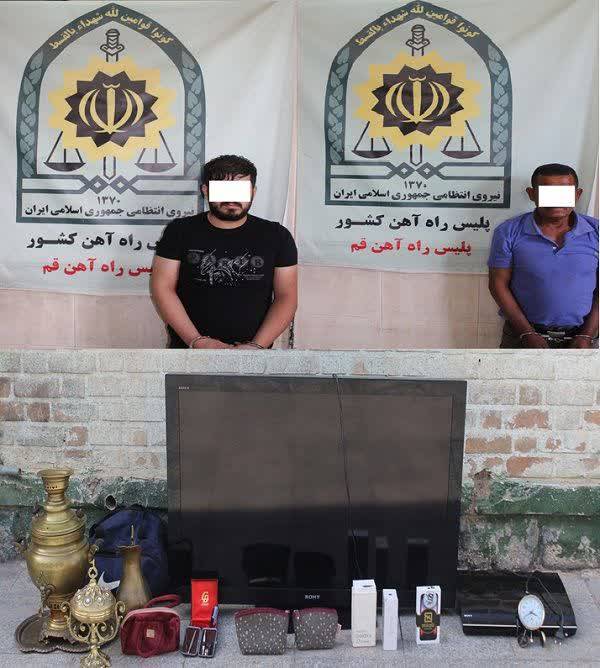 به گزارش پایگاه خبری ریل نیوز، سرهنگ ” سید علی اکبر کاظمی” در تشریح این خبر گفت: در پی وقوع یک مورد سرقت از منازل سازمانی راه آهن قم، موضوع در دستور کار تیم عملیاتی پلیس راه آهن قم قرار گرفته که با انجام تحقیقات، تلاش شبانه روزی و اقدامات فنی و بکارگیری شیوه و شگردهای پلیسی، یکی از سارقان سابقه دار و تحت تعقیب پلیس آگاهی شهرستان قم شناسایی و پس از انجام هماهنگی های قضایی، مخفیگاه سارق در سطح شهر قم شناسایی و در اقدامی غافلگیرانه سارق بهمراه همدستش دستگیر و در بازرسی از محل اموال مسروقه شامل: تلویزیون ۴۸ اینچ سونی، سماور، سینی، پارچ و قندان مسی، سه دستگاه گوشی تلفن همراه و … کشف و ضبط گردید. در این خصوص متهمان بهمراه اموال مکشوفه به مقر انتظامی دلالت و در این خصوص پرونده تشکیل و تحت رسیدگی است.