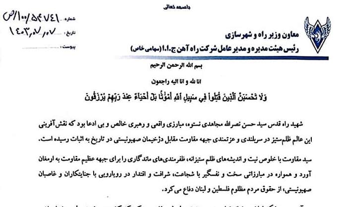 پیام تسلیت دکتر جبارعلی ذاکری، مدیرعامل راهآهن، در پی شهادت سید حسن نصرالله