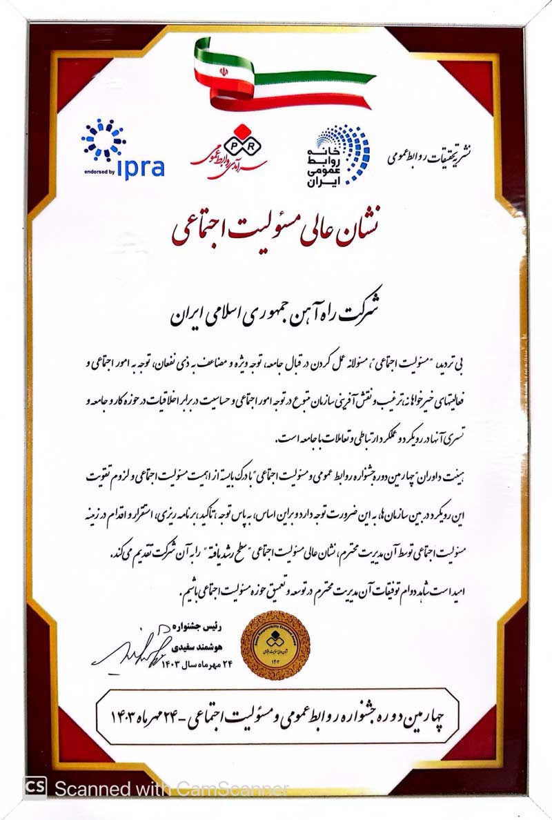 روابط عمومی شرکت راهآهن، در چهارمین دوره جشنواره روابط عمومی و مسئولیت اجتماعی، نشان عالی مسئولیت اجتماعی را دریافت کرد.