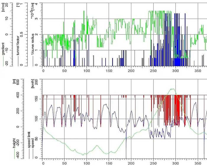 این شبیه سازی نشان میدهد که در شرایط عادی با دو لکوموتیو، زمان سفر در هر دو جهت حدود ۷ ساعت و ۱۸ دقیقه است.