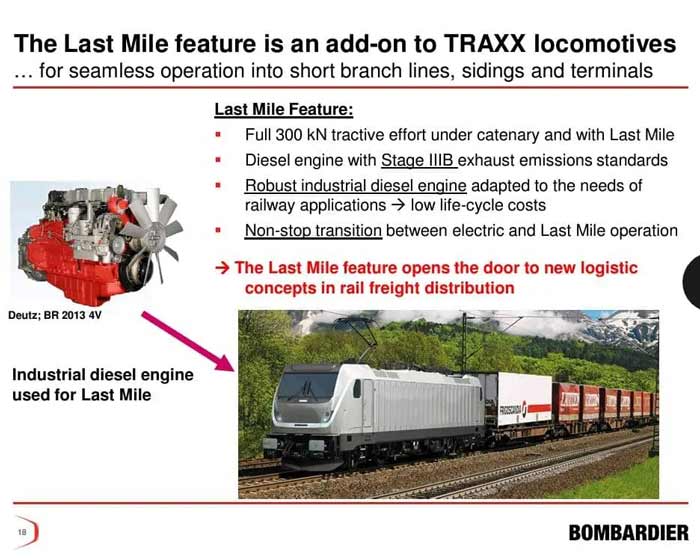 به گزارش پایگاه خبری ریل نیوز به نقل از تین نیوز ، قابلیت لکوموتیوهای برقی Last Mile در سیستم حمل و نقل باری انگلستان با تمرکز بر لکوموتیو TRAXX بمباردیر عنوان گزاره نمایی (پرزنتیشن) بود که مشروح آن در بیستمین کنفرانس سالانه گروه حمل و نقل ریلی باری در سال ۲۰۱۲ ارائه شد: