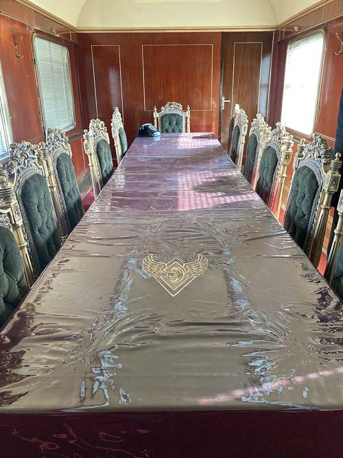 ۳ قطار سلطنتی (آبی- سرمهای و زرشکی) در واگنخانه توقف دادهشده که کوپههای لوکس آن شامل اتاق کار و جلسه، استراحت نیمروزی، خواب مشرف به سرویس حمام (وان صدفی)، نمایش فیلم، غذاخوری، محل بار و نوشیدنی. واگنهای مربوط به محافظان شامل کوپههایی برای خواب و استراحت، تفتیش و واگنهای خدمهنشین. آشپزخانههای مدرن با فِر و ظرفشویی تا ظروف چینی و کریستال اعلای سِرو که آبکاریهای طلا و نقره دارند، میز و صندلیهای درباری، پنکه و رادیو و تلفنهای اختصاصی میان واگن و کوپههایی که کفشان را فرشهای ایرانی زینت داده و پنجرههایش با پردههایی به پارچههای سفارشی پوشیده شده، جای دارند.