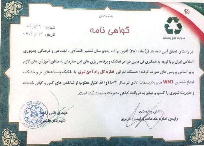راه آهن شرق موفق به کسب گواهینامه مدیریت پسماند شد
