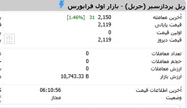 نماد حریل نیز با رشد ارزش ۱.۴۶ درصدی در آخرین روز فروردین ماه روبرو شد که می تواند نشانه ای از شکل گیری بازار صعودی در بخش حمل و نقل ریلی باشد.