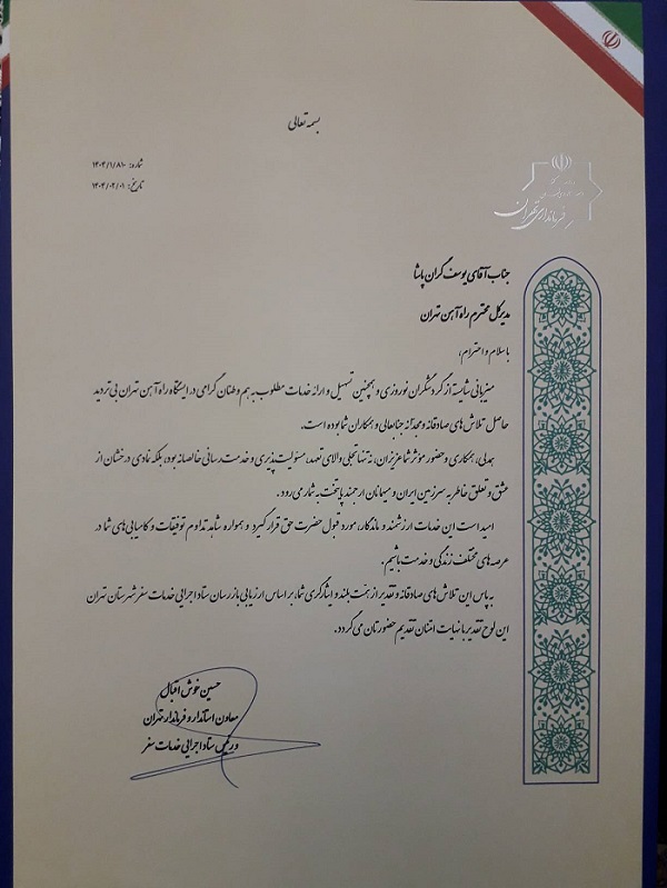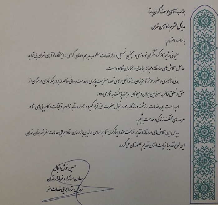 ستاد اجرایی خدمات سفر استان تهران این ارزیابی را بر اساس بازرسی میدانی بازرسان این دستگاه و شاخص های تعیین شده برای ارزیابی کیفیت خدمت رسانی به اداره کل راه آهن استان تهران اهدا کرده است.