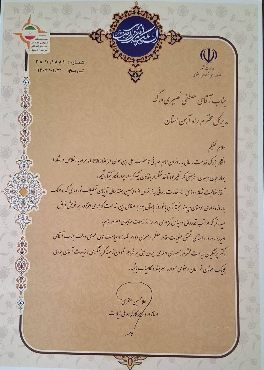 استاندار خراسان رضوی با صدور حکمی، از راه آهن این استان به عنوان دستگاه برتر خدمت رسان به مسافرین نوروزی تقدیر کرد.