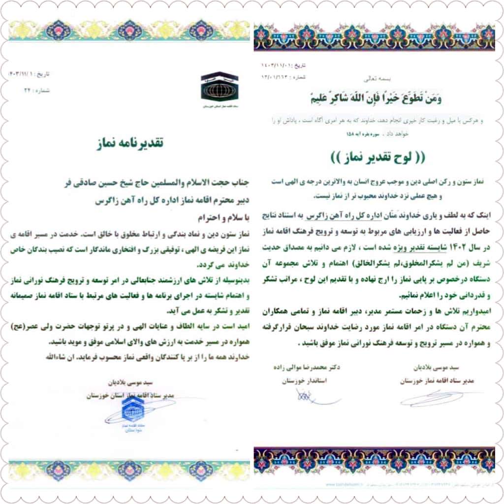 در آیین تجلیل از دستگاههای برتر ترویج فرهنگ اقامه نماز، اداره کل راهآهن زاگرس، به عنوان سازمان نمونه استان خوزستان شناخته شد.