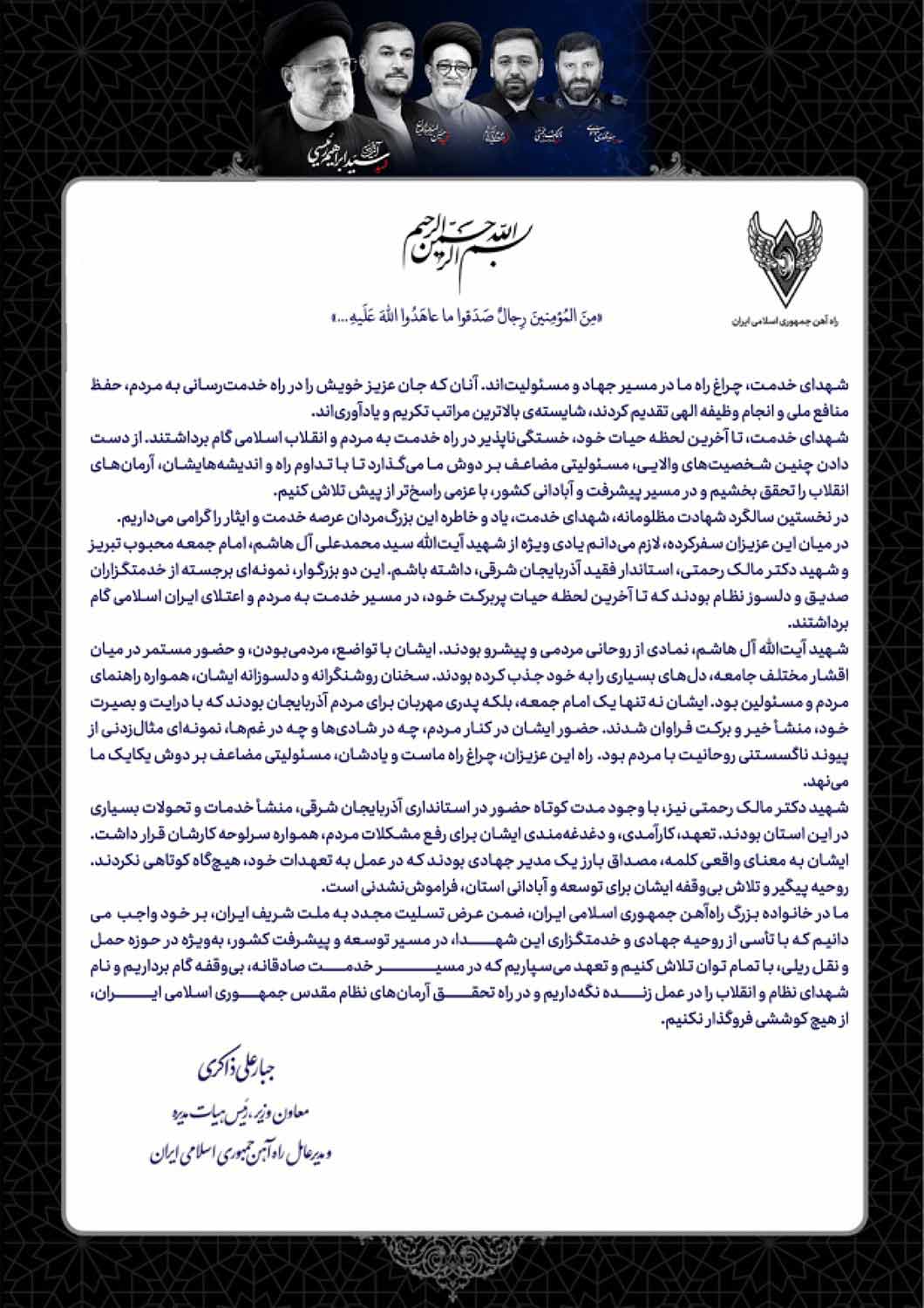 ▪️ما در خانواده بزرگ راهآهن جمهوری اسلامی ایران، ضمن عرض تسلیت مجدد به ملت شریف ایران، بر خود واجب میدانیم که با تأسی از روحیه جهادی و خدمتگزاری این شهدا، در مسیر توسعه و پیشرفت کشور، بهویژه در حوزه حمل و نقل ریلی، با تمام توان تلاش کنیم و تعهد میسپاریم که در مسیر خدمت صادقانه، بیوقفه گام برداریم و نام شهدای نظام و انقلاب را در عمل زنده نگهداریم و در راه تحقق آرمانهای نظام مقدس جمهوری اسلامی ایران، از هیچ کوششی فروگذار نکنیم.