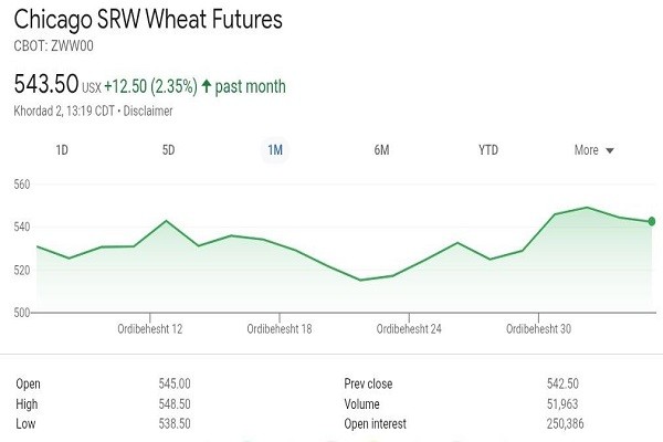 بازار جهانی گندم به تازگی در پی عواملی متعدد، با افزایش قیمت قابل توجه مواجه شده است. اعمال تعرفه های گمرکی دونالد ترامپ بر واردات کالا از کشورهای مختلف، افزایش تنش میان روسیه و اوکراین در میانه مذاکرات صلح و هچنین افزایش ترس در بازارهای جهانی، منجر به نوعی بی ثباتی اقتصادی در اقصی نقاط جهان شده است. همانطور که در نمودار زیر مشاهده می فرمایید، قیمت قراردادهای آتی گندم در بورس محصولات کشاورزی شیکاگو آمریکا، طی یک ماه گذشته بیش از ۲ درصد رشد داشته که نشانگر افزایش انتظار تورمی بازارهای جهانی به ویژه در آمریکا به عنوان بزرگترین اقتصاد جهان است.