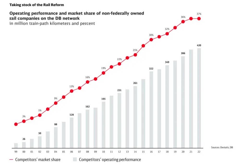 این گزارش نکات بسیار ارزشمندی در زمینه اصلاح ساختار راه آهن آلمان در ۳۰ سال گذشته ارائه می کند از جمله دوره خردمندانه افزایش سهم بخش خصوصی در حمل بار ریلی در صفحه ۱۶ از کمتر از ۳ درصد در سال ۱۹۹۹ به ۳۷ درصد در سال ۲۰۲۲ که سبب تغییر رویکرد به دولتی سازی مجدد مانند راه آهن انگلیس نشد.