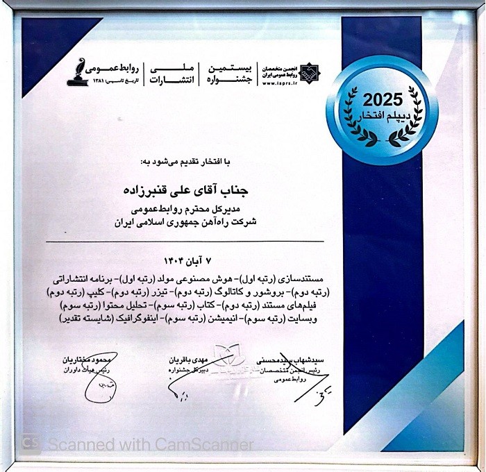 در بیستمین جشنواره ملی انتشارات روابط عمومی که ۷ آبان ماه جاری در مرکز همایشهای سازمان مدیریت صنعتی برگزار شد، روابط عمومی راهآهن علاوه بر کسب رتبه نخست در رشتههای مستندسازی تصویری و هوش مصنوعی، موفق به کسب رتبه دوم در رشتههای برنامه انتشاراتی، بروشور و کاتالوگ، تیزر، کلیپ و فیلمهای مستند و رتبه سوم در رشتههای کتاب، تحلیل محتوا، وبسایت و انیمیشن شد. همچنین، آثار این روابط عمومی در رشته اینفوگرافیک نیز شایسته تقدیر شناخته شد.